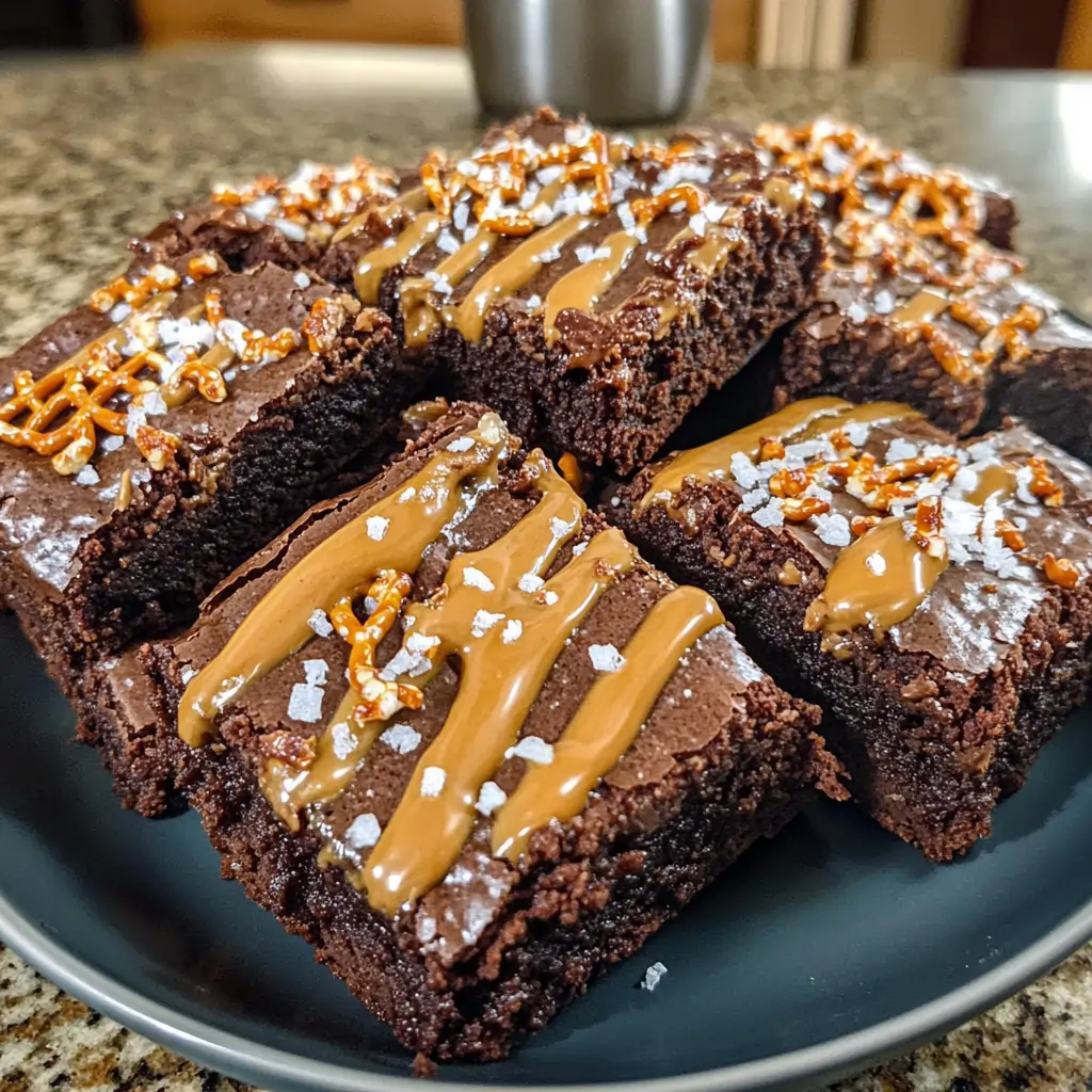 While the brownies are baking, it’s time to whip up a quick peanut butter drizzle. Just melt some peanut butter with a splash of milk or cream, and you’re good to go. When the brownies are fresh out of the oven and still warm, drizzle that peanut butter goodness all over the top. 🤤 Trust me, the combination of the fudgy brownies, the salty pretzels, and the creamy peanut butter is out of this world.
