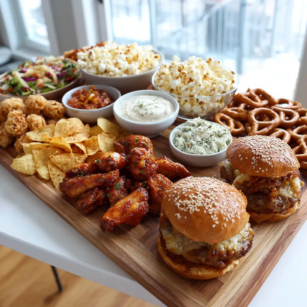 A delightful assortment of snacks perfect for game day, featuring nachos, sliders, wings, and various dips. Perfect for sharing with friends and family!