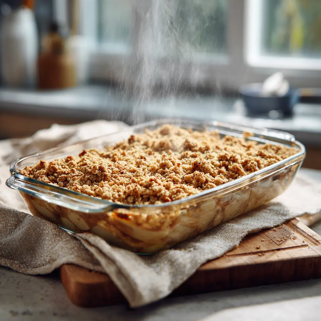 - Bake in the preheated oven for 30–35 minutes, or until the apples are tender and the topping is golden brown and crisp.