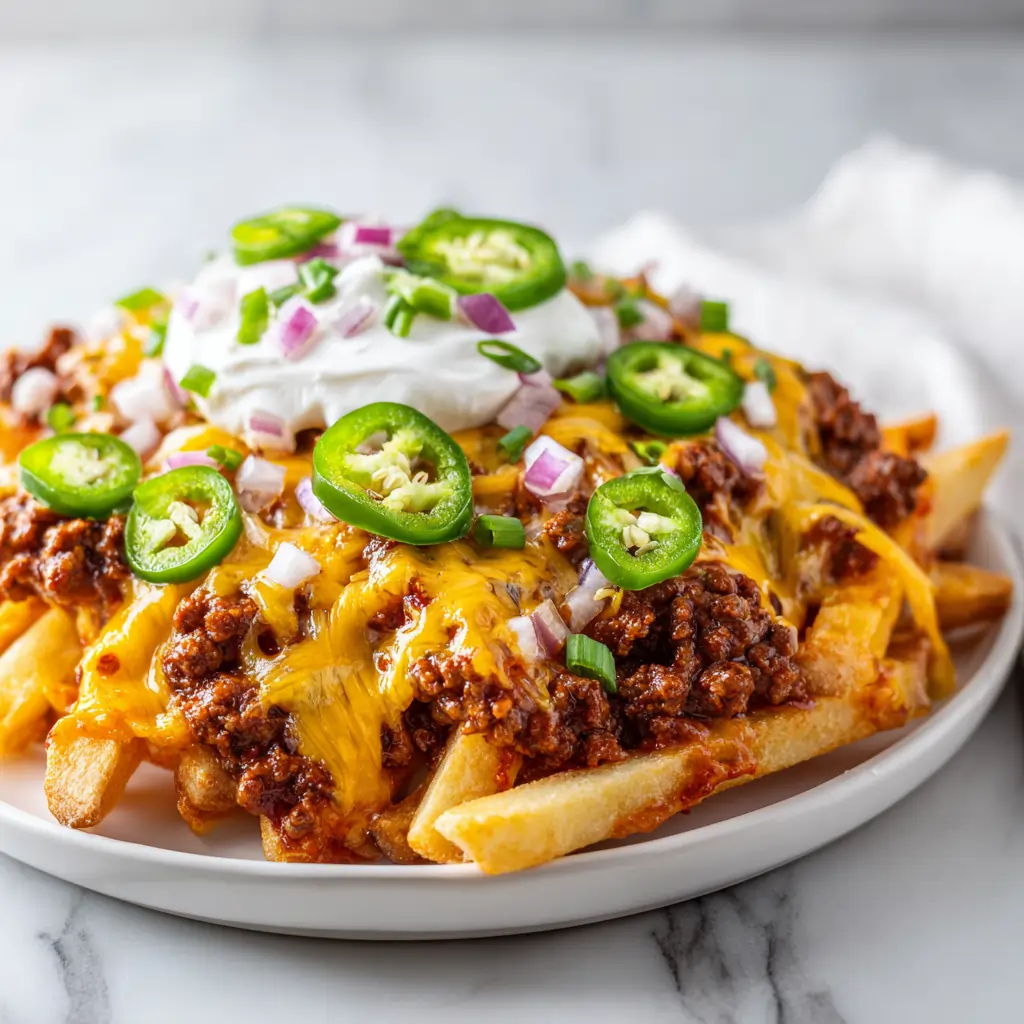 These Loaded Chili Cheese Fries are the ultimate snack or appetizer, combining crispy fries, savory chili, and gooey cheese for a deliciously indulgent treat.